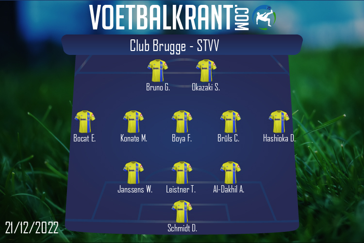 Bank: Denis Odoi - Cyle Larin - Kamal Sowah - Andreas Skov Olsen - Senne Lammens - Lynnt Audoor - Jorne Spileers - Antonio Nusa STVV: Daniel Schmidt - Ameen Al-Dakhil - Toni Leistner - Wolke Janssens - Daiki Hashioka - Christian Brüls - Frank Boya - Mory Konaté - Eric Junior Bocat - Shinji Okazaki - Gianni Bruno Bank: Jo Coppens - Aboubakary Koita - Daichi Hayashi - Olivier Dumont - Matte Smets - Stan Van Dessel - Jorge Teixeira |