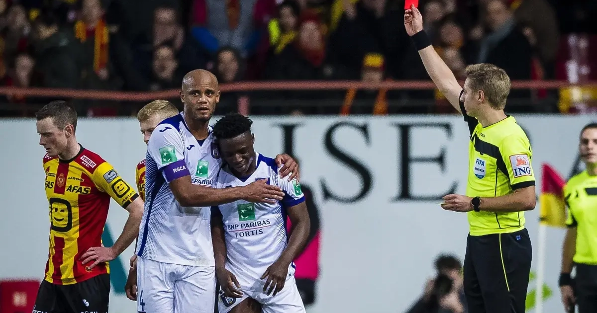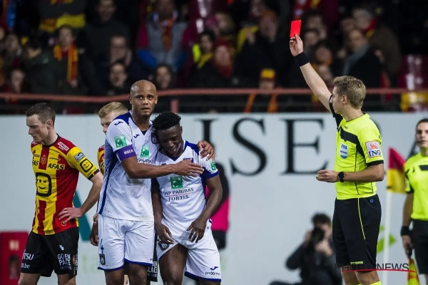 Het was wel Issa Kabore die Doku in de problemen bracht. Eerst beging die een 'oranje' overtreding op Vranckx en net voor rust tackelde hij te laat op de rechtsachter van Mechelen. Tweede geel en rood. Daar sta je dan na een heel sterke prestatie tegen Gent. Binnen Anderlecht hadden ze de pers al gewaarschuwd om niet te veel rond Doku te doen. Kwestie dat hij snel de pedalen verliest.