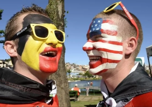 De sfeer rondom de Arena Fonte Nova voor de aftrap tussen België en Amerika is opperbest. De Belgische supporters zijn met minder dan 1000 zwaar in de minderheid, maar ze zijn wel piekfijn uitgedost.
