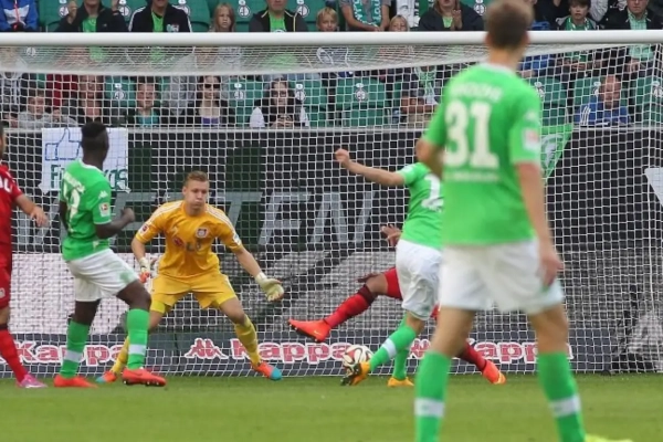 Wolfsburg startte furieus en Junior Malanda versierde al na zeven minuten een strafschop. Daarbovenop kreeg boosdoener Giulio Donati een rode kaart en werd de strafschop door Rodriguez feilloos omgezet. Drumic maakte gelijk, maar nog voor de rust kon Vierinha de 2-1 aantekenen.