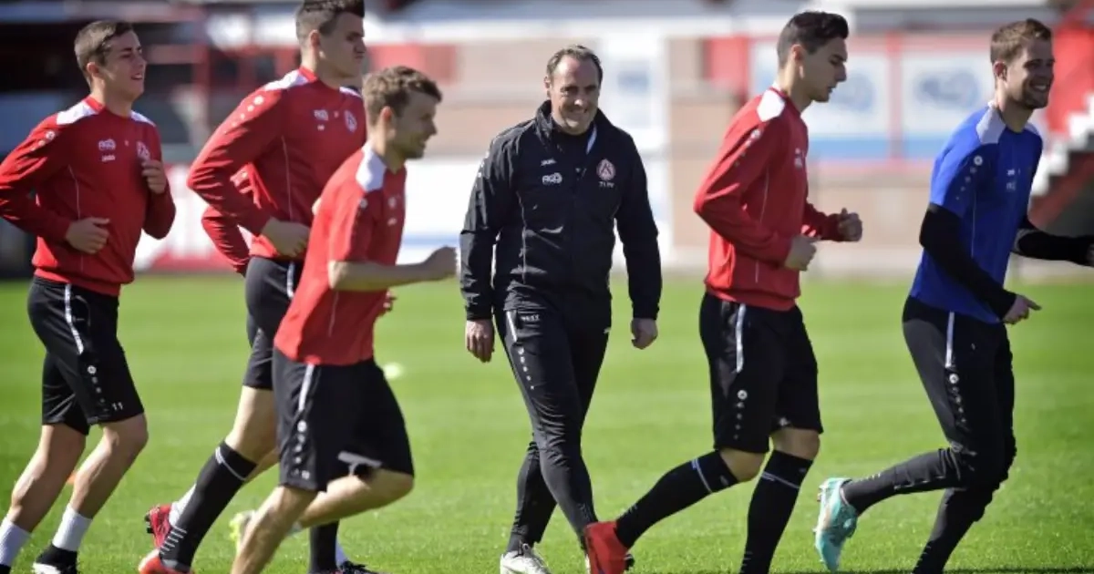 De training van de Kerels werd onder een stralende zon in het Guldensporenstadion afwerkt. Zo'n vijftigtal supporters streken er neer om de oefenmeester, die hen pas de rug toekeerde, de debatten te zien leiden.