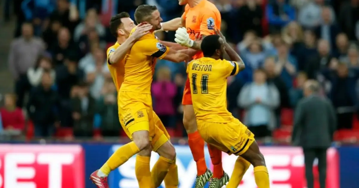 Nadat de 0-1 ongelukkig via zijn rug in doel belandde, werd doelman Bentley in de strafschoppenreeks uiteindelijk nog de held van de avond. Hij stopte de elfmeter van Wood en bezorgde zijn team zo de promotie.