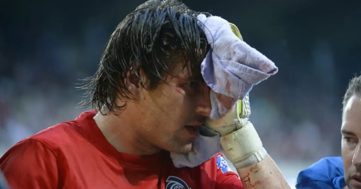 De knie van de Ghanees belandde op volle snelheid tegen het hoofd van de doelman. "Hij heeft een zware hersenschudding", aldus Maes. "Maar ik denk dat hij ook getekend is voor het leven, want hij heeft een serieuze hoofdwonde. Wel geen breuken."