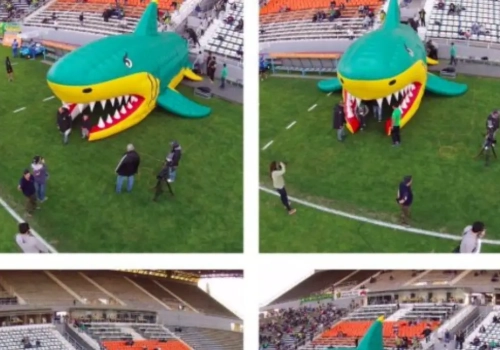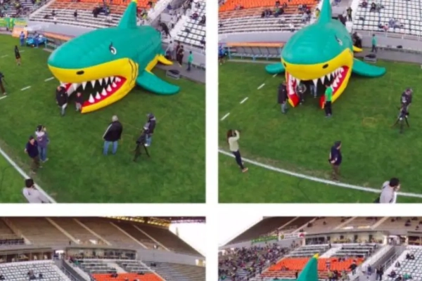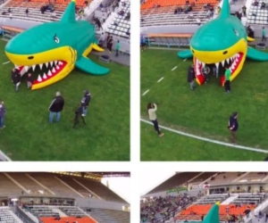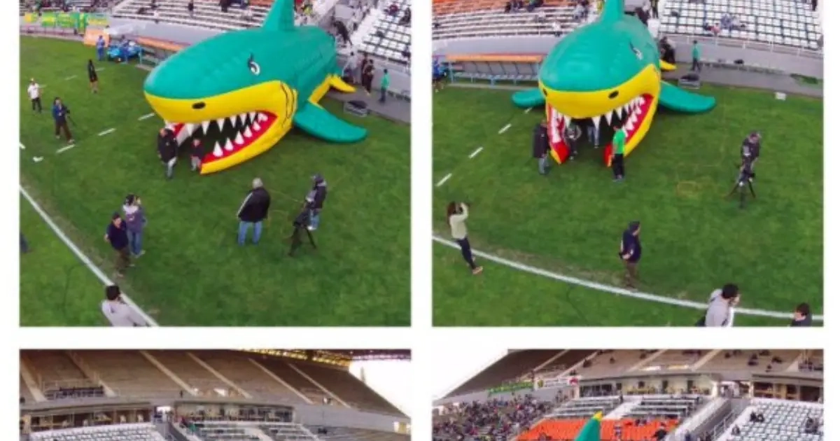 De spelers van de Zuid-Amerikaanse club komen voortaan uit de mond van een opgeblazen haai tevoorschijn. Als het opzet was: de tegenstander intimideren, dan is CA Aldosivi daar met brio in geslaagd.