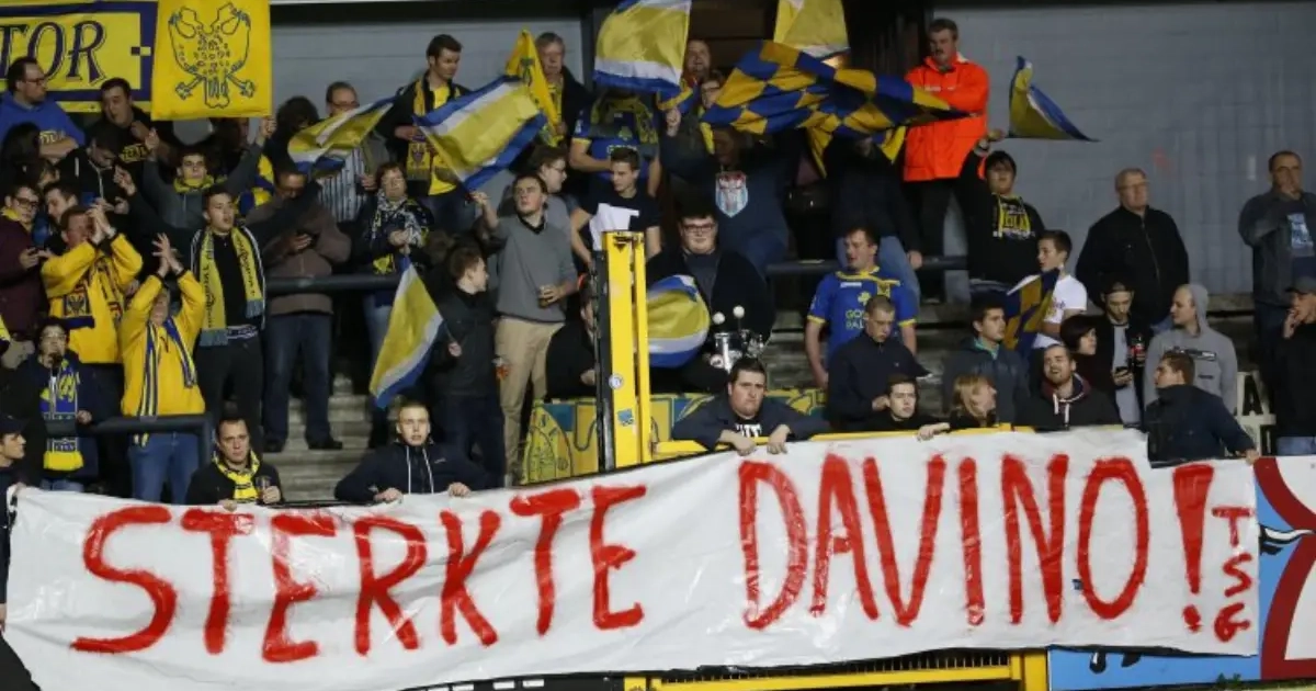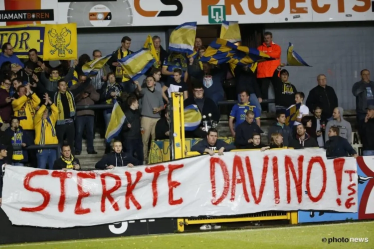 De fans van de Kanaries pakten uit met een spandoek waarop te lezen stond ‘Sterkte Davino’. Een hartverwarmende boodschap gericht aan Lokeren-doelman Davino Verhulst, die tegenwoordig door een zware periode gaat.