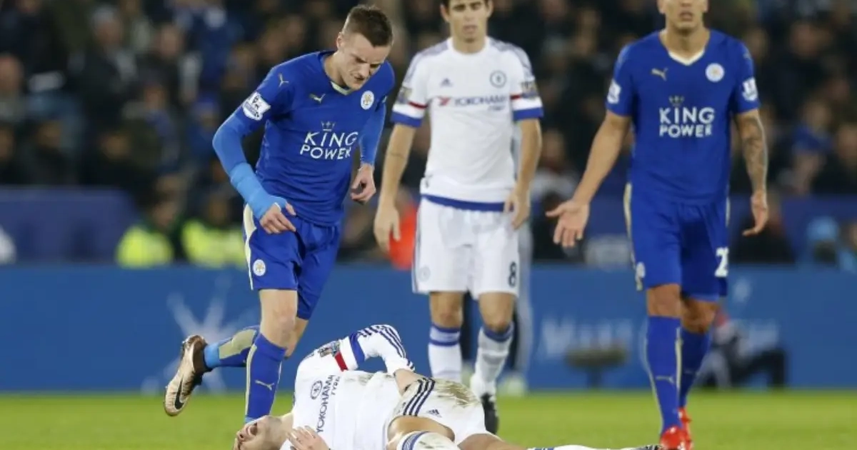 Na een halfuur op de klok werd het stadion opgeschrikt toen Eden Hazard een stevige por van Jamie Vardy kreeg. De Rode Duivel kwam slecht neer en moest met een heupblessure naar de kant.