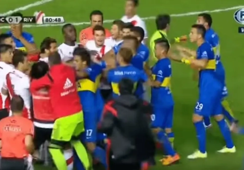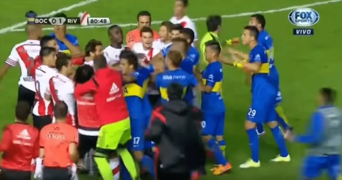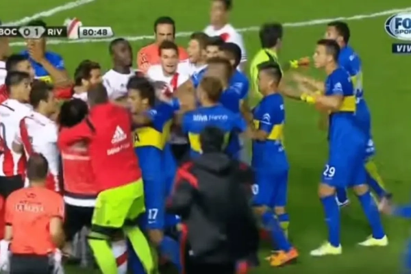 Peruzzi, ook van Boca, kreeg al snel rood en dus stonden de bezoekers met negen. Diaz ging verhaal halen bij de scheidsrechter en kreeg daarvoor ook rood. En toen barstte de hel pas goed los. Een massale vechtpartij brak uit en de politie moest tussenbeide komen. De ref trakteerde Maidana en Pisculichi nog op een rode kaart.