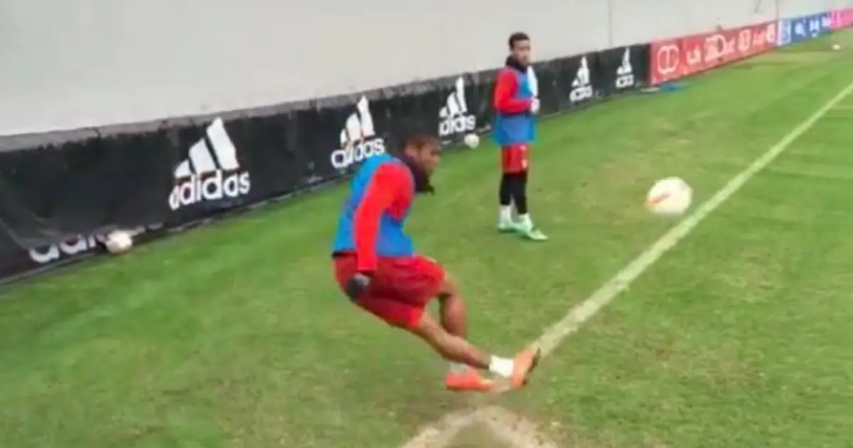 Tijdens wedstrijden is het altijd bittere ernst, maar op het trainingsveld van Bayern München gaat het er af en toe wel héél leuk aan toe. Deze keer etaleerde de Braziliaan Douglas Costa zijn klasse.