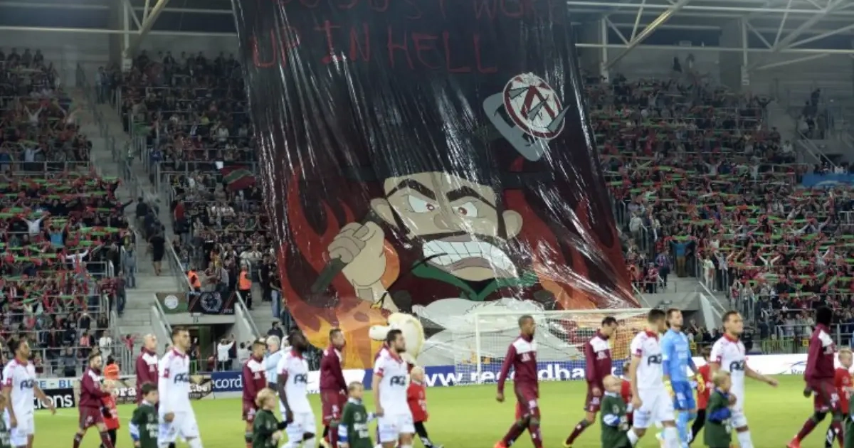 Met een heerlijke tifo wisten ze de puntjes op de i te zetten. Het logo van KV Kortrijk werd op een riek gestoken, de trotsheid droop ervan af. Knap gedaan van de South Lane Crew, de harde kern bij de fans van Essevee.