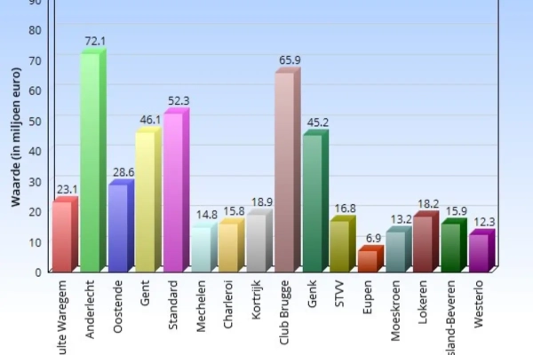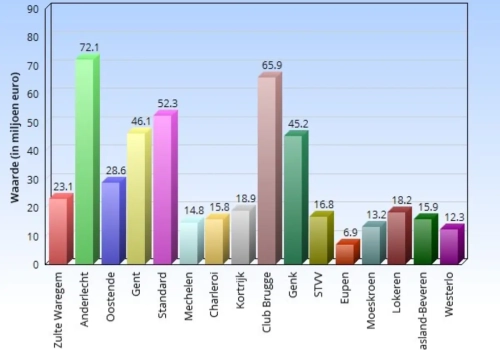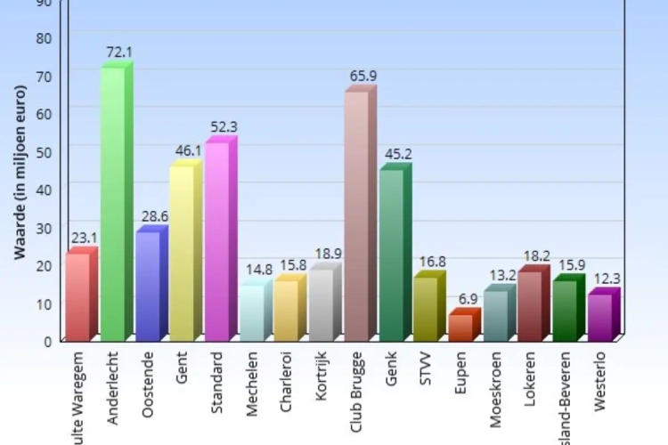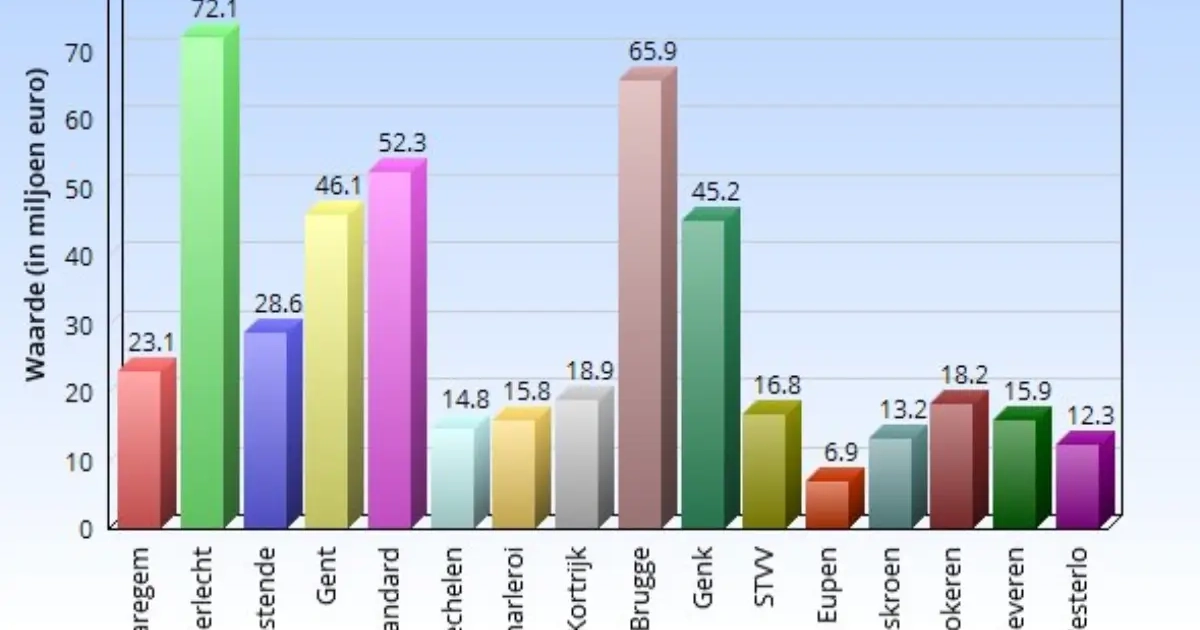 En ook Kortrijk, Charleroi en Mechelen doen het goed met al bij al weinig miljoenen aan waarde. We lijsten het even op en zien dat Club Brugge en Genk onder hun waarde staan gerangschikt.