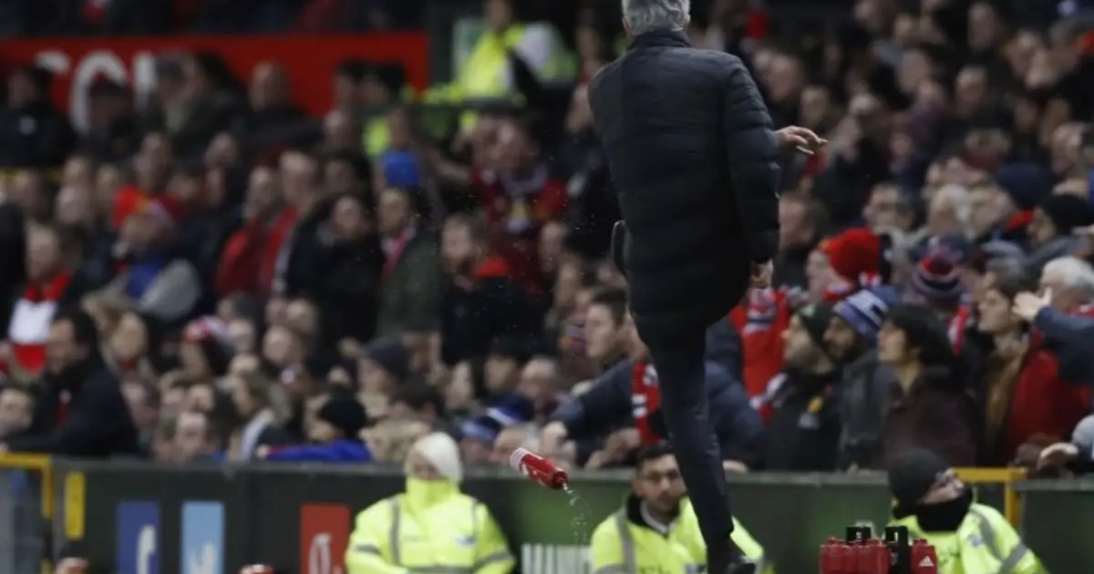 José Mourinho schopte in de Premier League-wedstrijd tegen West Ham tijdens de eerste helft woest een drinkbus met water weg. Scheidsrechter Jon Moss tolereerde dit gedrag niet en stuurde Mourinho rechtstreeks naar de tribune.