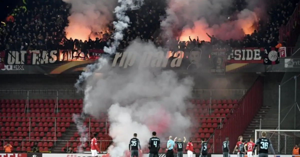 Vijf minuten. Langer hebben we niet moeten wachten op de eerste onlusten tussen de fans van Standard en Ajax. Deze keer waren het de Amsterdammers die de boel in lichterlaaie zetten.