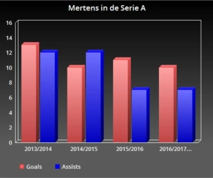 Mertens is gemiddeld om de 71,5 minuten beslissend voor zijn ploeg met een assist (7) of een goal (10). Vorig seizoen was dat om de 93 minuten, in 2014-2015 om de 138 minuten en in zijn eerste seizoen om de 104 minuten. Het seizoen is nog maar halfweg, maar Mertens lijkt al zijn vorige records aan diggelen te gaan slaan. Zijn eerste - en beste seizoen tot nu toe - scoorde hij 13 goals en gaf 12 assists.