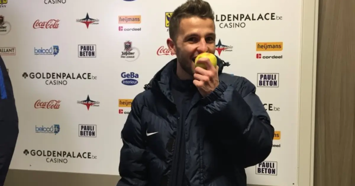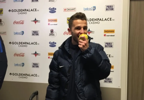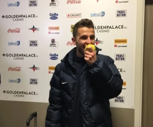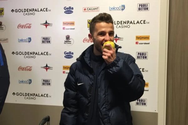 De 20-jarige winger liep niet met een traditionele recuperatiedrank het stadion uit, wél met een Haspengouwse appel. De tegenstrever een beetje jennen hoort nu eenmaal bij de Limburgse derby.