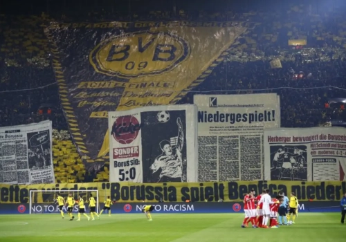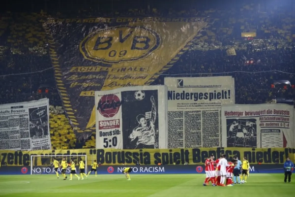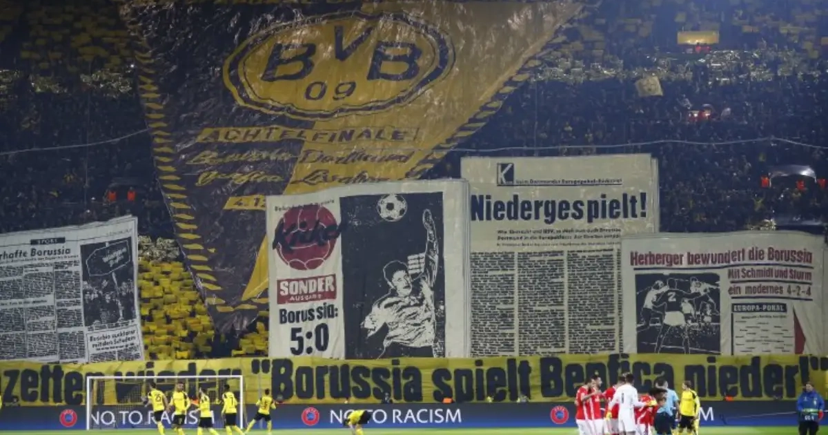 Die Gelbe Wand met 25.000 supporters in de staantribune achter de goal was er klaar voor. Zij pakten uit met een ongelooflijke tifo, zoals u hieronder kunt zien. Er stond te lezen: “Morgen schrijven de kranten opnieuw: Borussia speelt Benfica helemaal weg.”