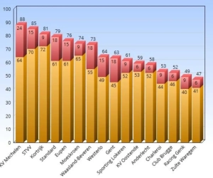 Club Brugge, Gent, Charleroi én Zulte Waregem vinden we in de onderste vijf. Niemand pakte minder gele kaarten dan Racing Genk, die in 30 speeldagen maar tot 40 kaarten kwamen – 1,33 per wedstrijd, straf.