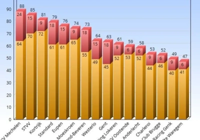 Als we naar de gele kaarten gaan kijken, dan is KV Kortrijk de ‘topper’ van dienst, op de voet gevolgd door STVV. Ook Moeskroen en KV Mechelen sprokkelden heel wat gele kaarten, terwijl diverse clubs uit play-off 1 veel minder kaarten slikten.