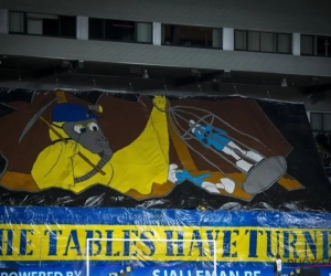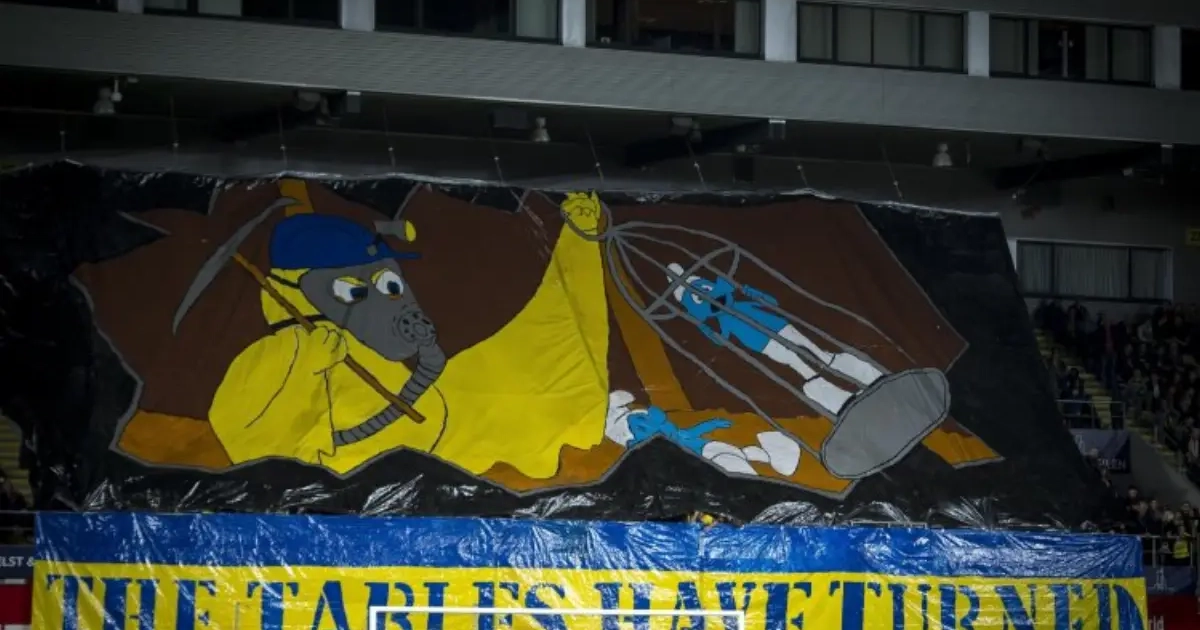 Geen duel der gouwgenoten zonder gepaste tifo van de thuisploeg. Dat was zaterdagavond niet anders. Voor één keer geen leeuw in een kooi, Willy Sommers. Wel een Smurf die door een Kanarie gevangen werd genomen, mét toepasselijk onderschrift.