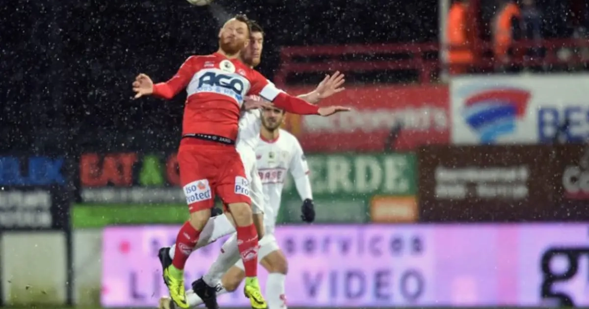 De partij tussen Oostende en Racing Genk werd afgelast door de stevige storm, maar op Kortrijk wordt momenteel wel gevoetbald. Al lijken de omstandigheden verre van ideaal.