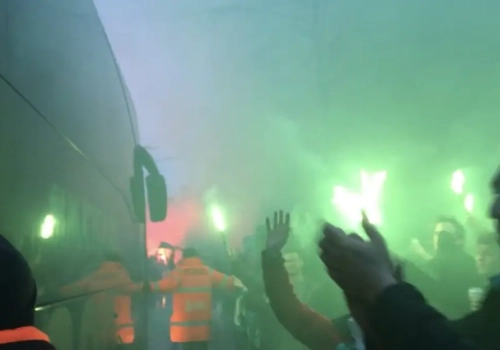 ? Waanzin: intrede spelersbus Cercle Brugge voor het beslissende treffen met Beerschot-Wilrijk in groen-zwarte mensenzee
