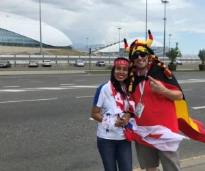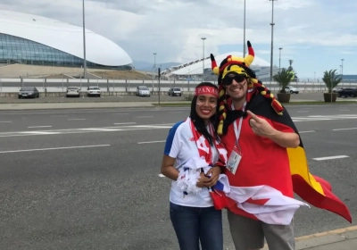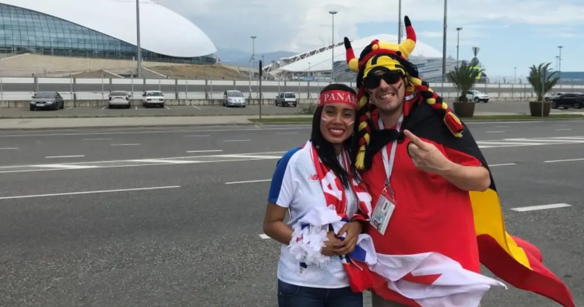 We keken toch op toen we Jennylith Gil en David Keller zagen wandelen richting het stadion van Sochi. Zij volledig gehuld in de Panamese kleuren, hij in volwaardige Belgische Galliër-outfit. "Toen we ontdekten dat Panama tegen België zou spelen, moesten we wel naar hier afzakken. Die loting kon niet beter zijn."