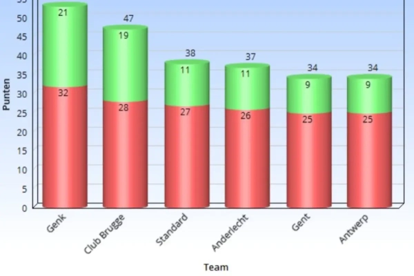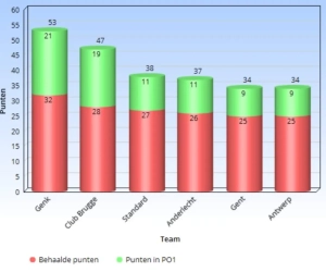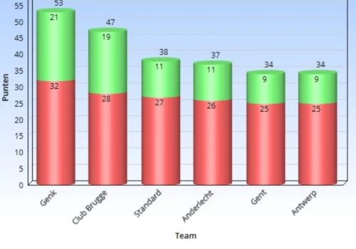 Genk was de primus, met 21 op 30. Club Brugge volgt op korte afstand, de vier andere teams op een grotere afstand.