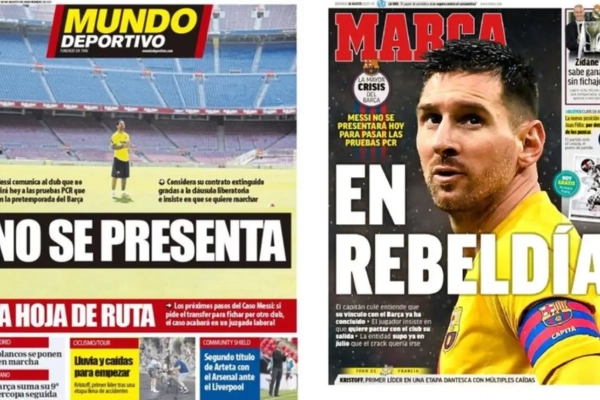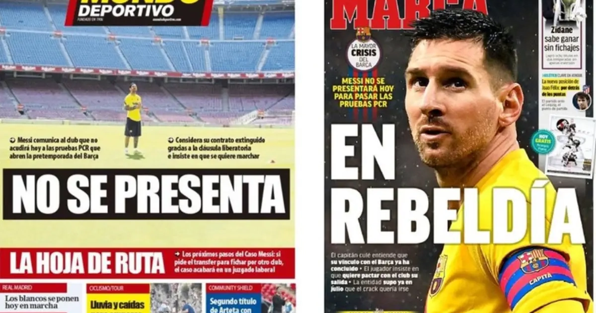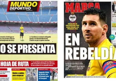 Zaterdagavond lekte al uit dat Messi zich niet zou melden voor de verplichte coronatests op de club en zondag pakken de Spaanse kranten daar gretig mee uit. Messi ligt op ramkoers met het bestuur, dat enkel nog wil praten over een contractverlenging.