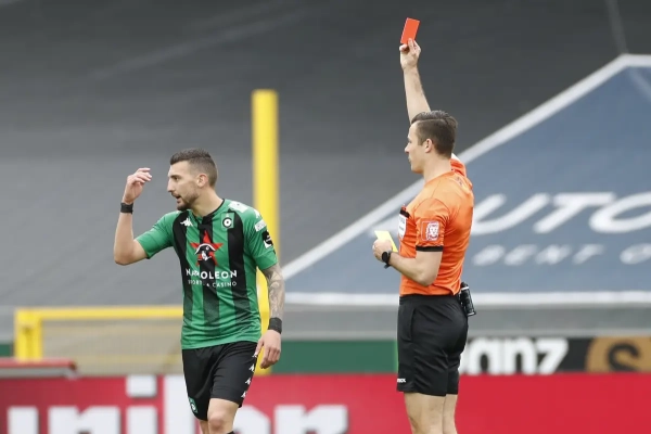 Dimitar Velkovski kreeg een rode kaart in de wedstrijd tegen Beerschot en mag even gaan bezinnen van het Bondsparket.