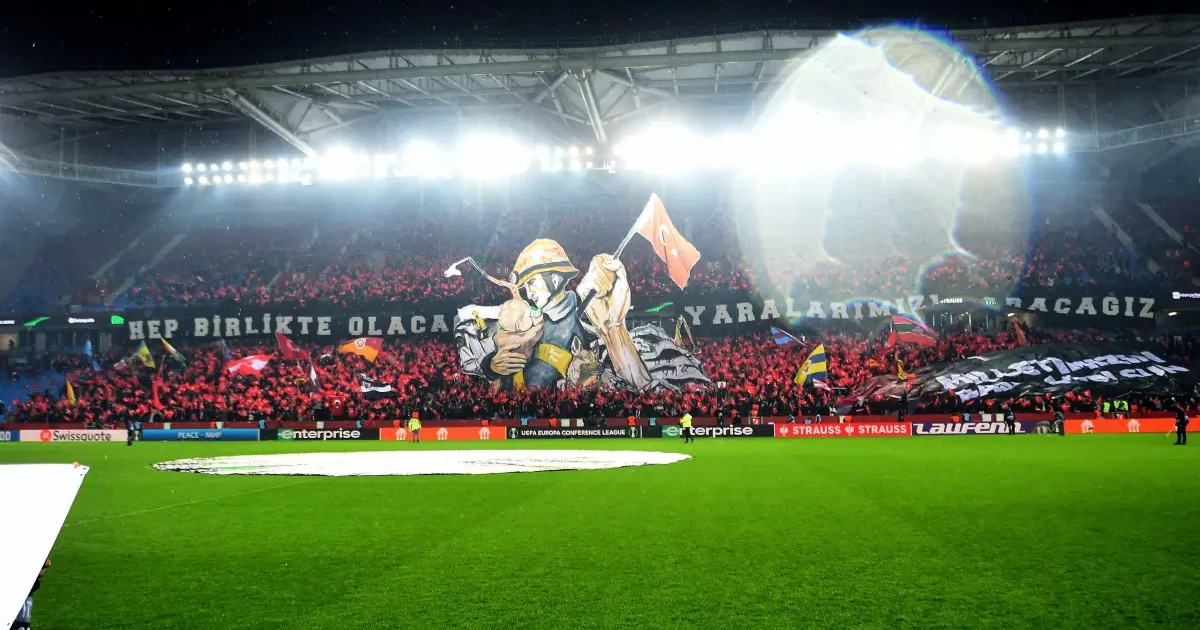 Met alles wat in Turkije en Syrië gaande is, wat het extra bijzonder dat Trabzonspor donderdag Europees speelde. Een schitterende tifo vooraf verwees ook naar de gevolgen van de aardbeving.