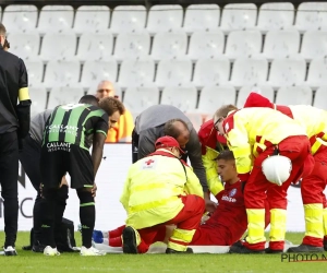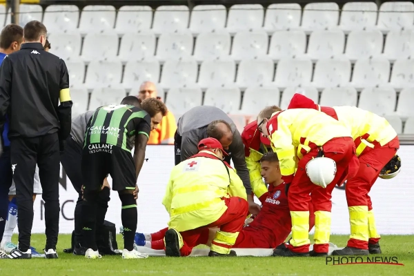 Een hersenschudding? Dat zal onderzoek moeten uitwijzen. De doelman van KAA Gent - met een verleden bij Cercle Brugge - werd in ieder geval in een ambulance meteen afgevoerd naar het ziekenhuis voor meer onderzoek.