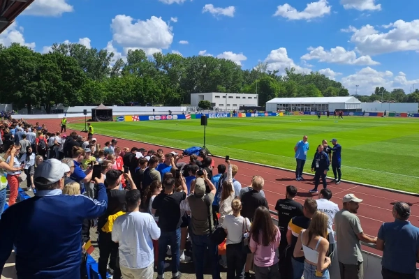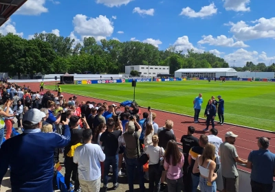 Drankkraampjes rond het veld, pizzapunten en braadworsten, zonnetje los op de bol... De voormiddag werd voor de lokale jeugd van Freiberg een echt feest. En dan kregen ze nog wat internationale sterren van dichtbij te zien.