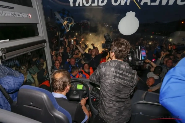 Eenmaal aan boord werden ze aangesproken door Club-verdediger Jorne Spileers. “Wat is dat hier maat? Moeten jullie mee? Echt? Zet jullie maar vooraan dan", reageerde hij zichtbaar verrast maar geamuseerd.
