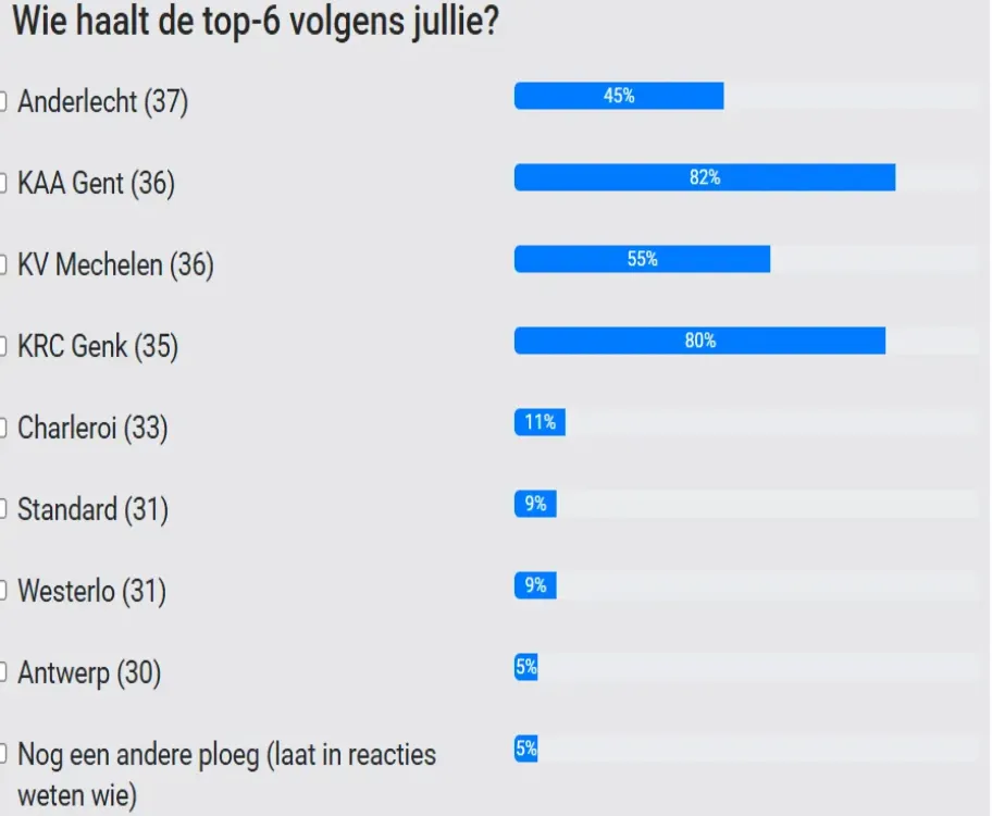 Een paar weken geleden polsten we al een eerste keer bij jullie naar wie volgens u - samen met Union SG, Club Brugge en STVV - naar de Champions' Play-offs zou mogen. De resultaten daarvan waren vrij tot zeer helder te noemen.